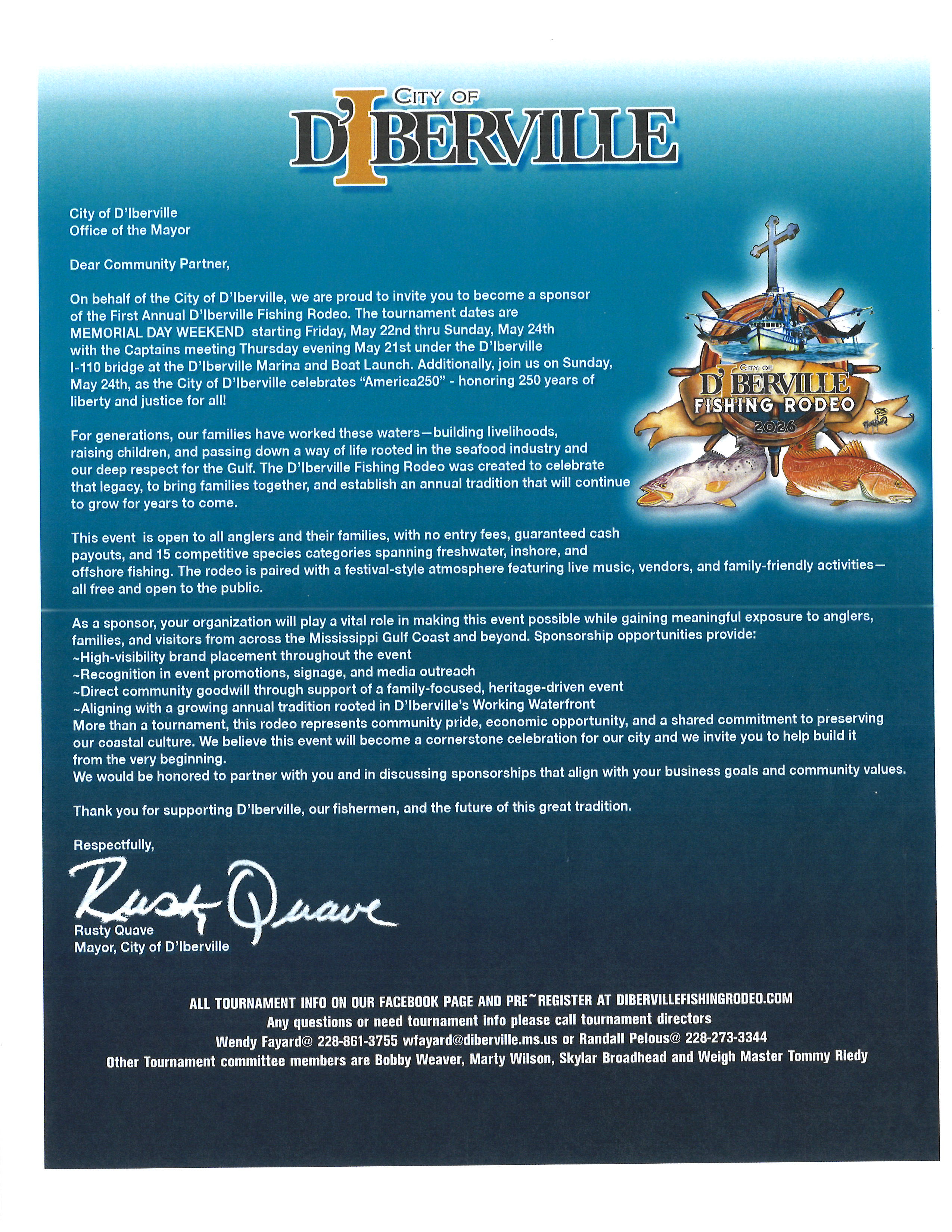 Read the signed community partner letter from Mayor Rusty Quave and learn how sponsors can support the first annual D'Iberville Fishing Rodeo.