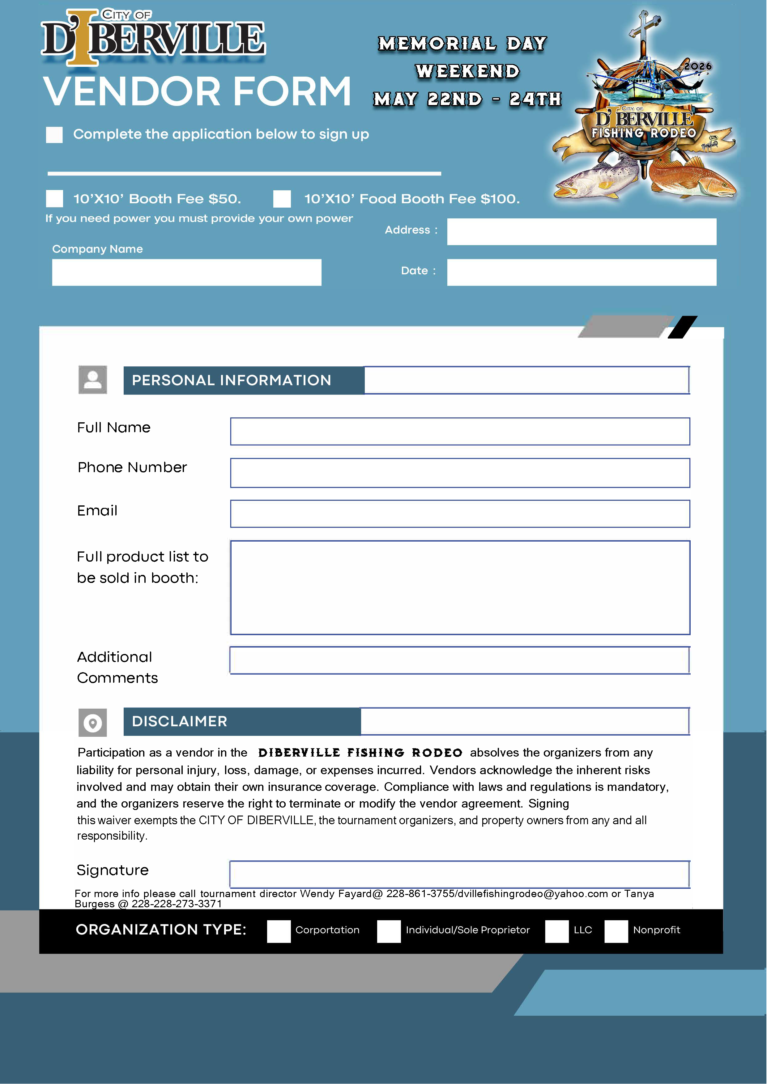 Apply to participate as a vendor during Memorial Weekend at the D'Iberville Fishing Rodeo. Review the application, complete the form, and send it to the tournament team by email.